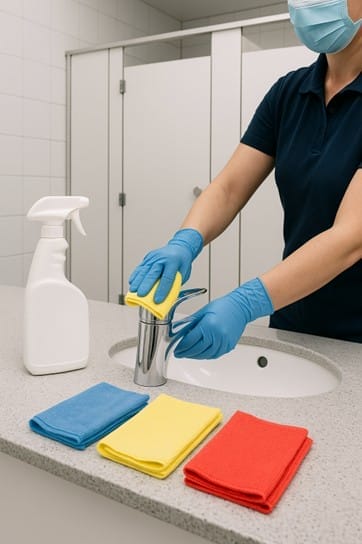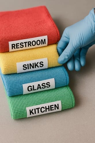 Think about this: the same cloth that cleans a lunchroom counter should never be used in a restroom. A mop used on a bathroom floor should never touch an office lobby. Without clear systems and discipline, germs can move from the dirtiest areas of a building straight into the places people eat, meet, and work.